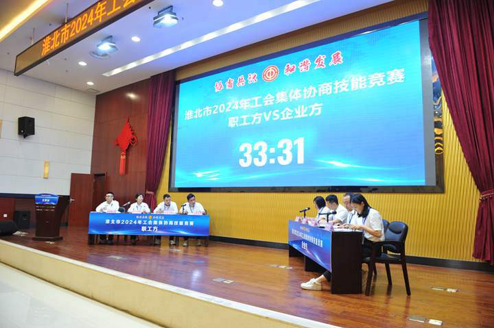 競賽以“協(xié)商共識、和諧發(fā)展”為競賽主題,旨在充分發(fā)揮集體協(xié)商制度在協(xié)調(diào)勞動關(guān)系中的重要作用,錘煉一支高素質(zhì)、善溝通、會協(xié)商、有擔(dān)當(dāng)?shù)募w協(xié)商人才隊伍,切實(shí)提升淮北市集體協(xié)商質(zhì)量,促進(jìn)勞動關(guān)系和諧穩(wěn)定。此次競賽匯集了全市各縣區(qū)、行業(yè)工會及淮北礦業(yè)集團(tuán)、皖北煤電集團(tuán)、中煤礦建集團(tuán)、淮海實(shí)業(yè)集團(tuán)10支代表隊伍,他們圍繞職工權(quán)益維護(hù)、福利待遇等問題,在模擬場景中進(jìn)行集體協(xié)商,由評委組對協(xié)商呈現(xiàn)效果進(jìn)行專業(yè)點(diǎn)評。各支參賽隊伍圍繞“協(xié)商共識、和諧發(fā)展”活動主題,依據(jù)理、法、情,透徹分析案例、準(zhǔn)確運(yùn)用政策、縝密邏輯推理、合理設(shè)置身份、流暢配合協(xié)作,各抒己見,據(jù)理力爭,較好展示了參賽隊伍的風(fēng)采,比賽現(xiàn)場氣氛熱烈,緊張有序。競賽評定團(tuán)體一等獎、二等獎、三等獎和個人獎項“最佳協(xié)商員”“優(yōu)秀協(xié)商員”“協(xié)商能手”,同時設(shè)置優(yōu)秀組織獎。