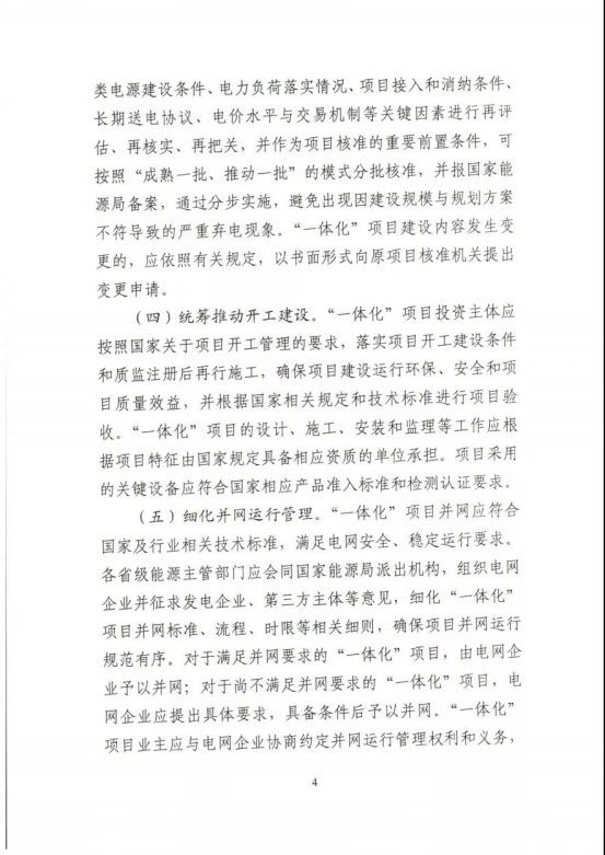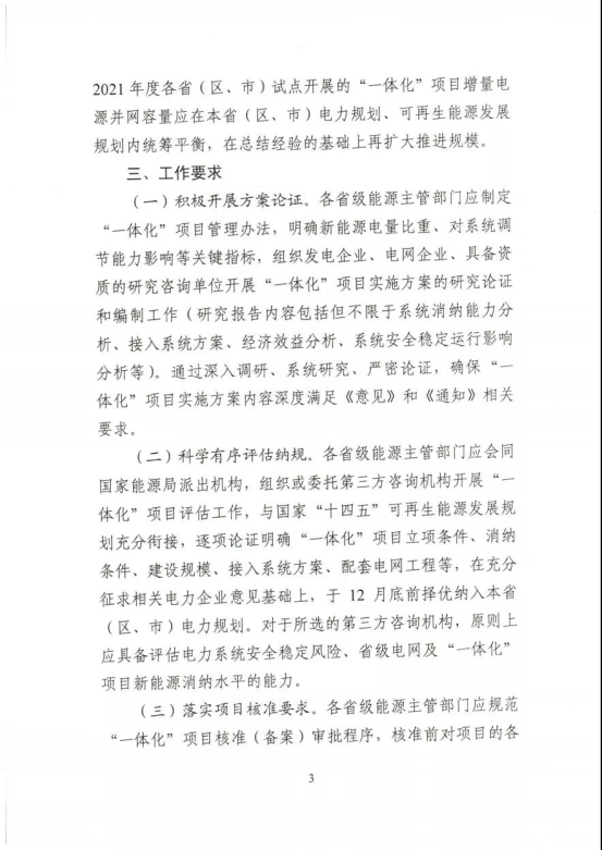 工作要求:積極開展方案論證。科學(xué)有序評估納規(guī)。落實項目核準(zhǔn)要求。統(tǒng)籌推動開工建設(shè)。細(xì)化并網(wǎng)運(yùn)行管理。優(yōu)先推進(jìn)鄉(xiāng)村振興項目。鼓勵重大創(chuàng)新示范。在上述工作要求中,《通知》要求,各省級能源主管部門應(yīng)開展“一體化”項目評估工作,與國家“十四五”可再生能源發(fā)展規(guī)劃充分銜接,逐項論證明確“一體化”項目立項條件、消納條件、建設(shè)規(guī)模、接入系統(tǒng)方案、配套電網(wǎng)工程等,在充分征求相關(guān)電力企業(yè)意見基礎(chǔ)上,于12月底前擇優(yōu)納入本省(區(qū)、市)電力規(guī)劃。
