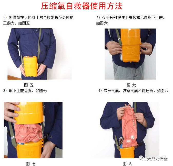 1)佩戴時(shí)將自救器移至右前方,左手拖住自救器底部,右手打開保護(hù)套,用大母指用力搬開開啟扳手;