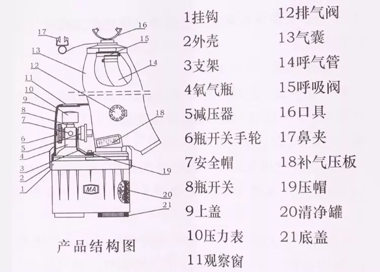 1、自救器主要由高壓系統(tǒng)、呼吸系統(tǒng)及CO2 過濾系統(tǒng)組成。高壓系統(tǒng)包括氧氣瓶、氧氣瓶開關(guān)、減壓器、自動(dòng)手動(dòng)補(bǔ)給閥和壓力表等。